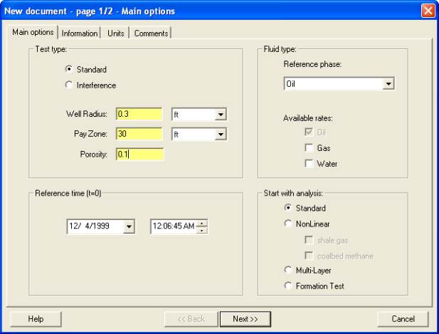 This dialog allows you to choose the test type, reference fluid type, the available fluid rates,