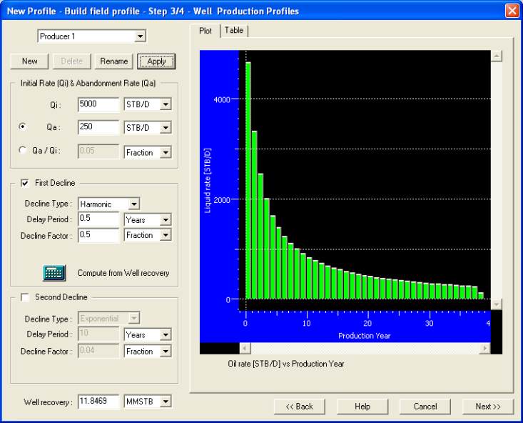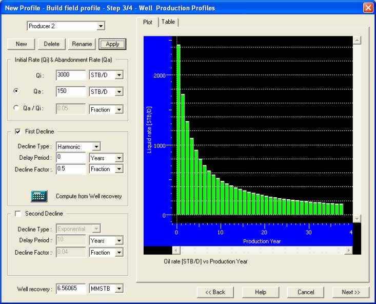 2’. Enter an initial rate of 3000 STB/D, a final rate of 150 STB/D, no delay (0 year) and a