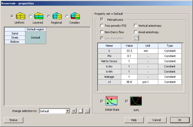 Click on the “Properties” button in the Simulation page to access the “Reservoir – Properties”