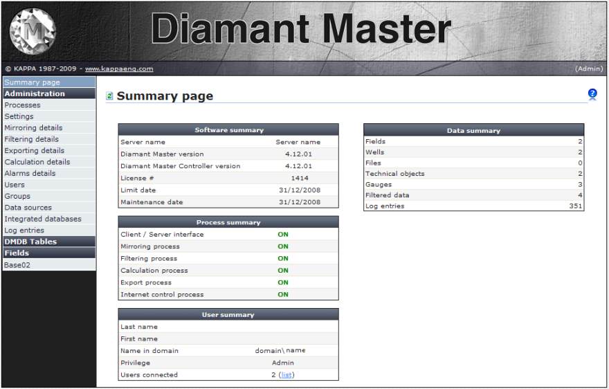 The 'Summary' page displays the information about the server, the users, the field and data on