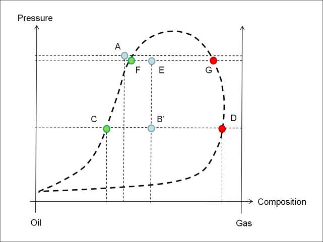 the bubble point, so gas remains present in the system (points F and G), even if the final
