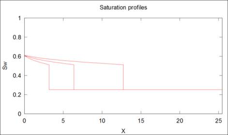 of the saturation profiles during the 1D flooding of the porous medium. The left side of Figure 6